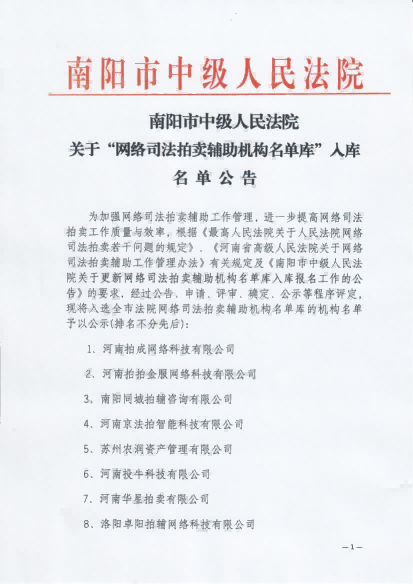 名稱:南陽(yáng)市中級(jí)法院網(wǎng)絡(luò)司法拍輔機(jī)構(gòu)名單庫(kù)